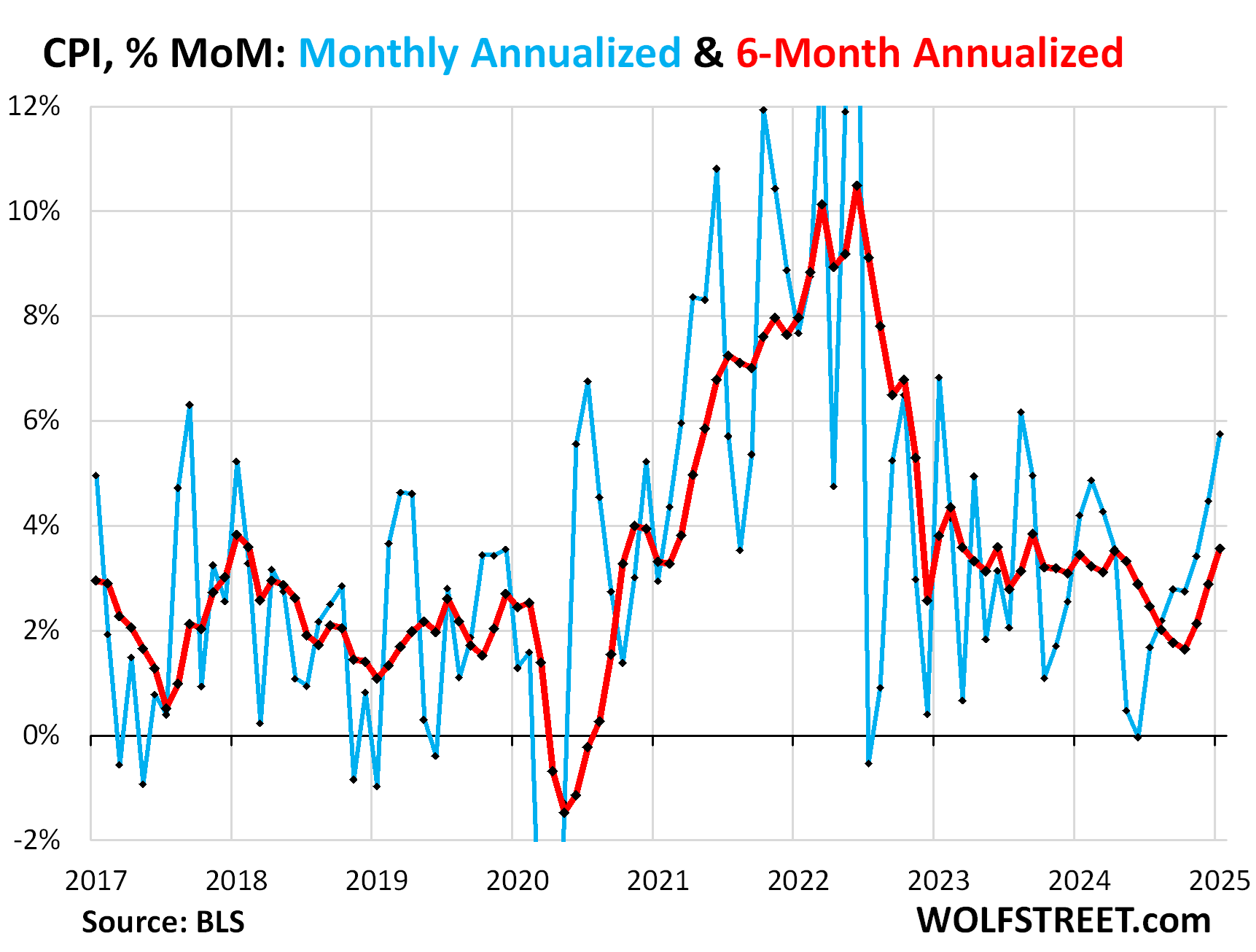 Let’s start with the last item that continues unabated from late last year because rising inflation will continue to be a driving force for some of the things I predicted for 2025. Two inflation reports came out this week, and both of them were hotter than expected (expected by others, that is). First, CPI came out, reporting the worst month-on-month inflation acceleration since August of 2023 when the Fed was still having to tighten hard against inflation.