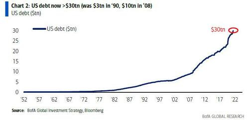 Let's not forget locally that, in the US, sovereign debt has piled up like this: (Notice that for the first time there were a couple of straight-up legs there during the COVIDcrisis. That's as parabolic as you get.)