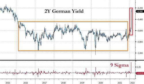 As Bloomberg's Ven Ram writes, Lagarde has uncorked the genie from Europe's bottle of unintended consequences.... Last week two-year German yields rose at a pace not seen in years, corporate spreads widened and rates volatility received a kickstart. In effect financial conditions tightened, contrary to the European Central Bank’s avowed intentions.... This means risk-models (VaR) will be blowing out in every bank and fund.