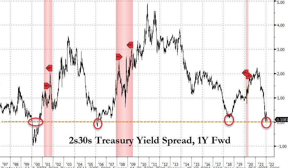 That rapid rise in the 2YR is now causing the yield curve to quickly assume the pre-recession flat-on-its-back, screw-me-over position that the Fed did not allow it to assume when the Fed was buying up vast quantities of government bonds across the spectrum of the curve in whatever amounts at each inflection point it needed to do in order to get the curves to undulate in the manner it wanted to see (without ever saying it was forcing yields to yield to its control just like it didn't say it had returned to QE in the fall of 2019 when it was doing all it could to get us out of the "Repocalypse" that it created).