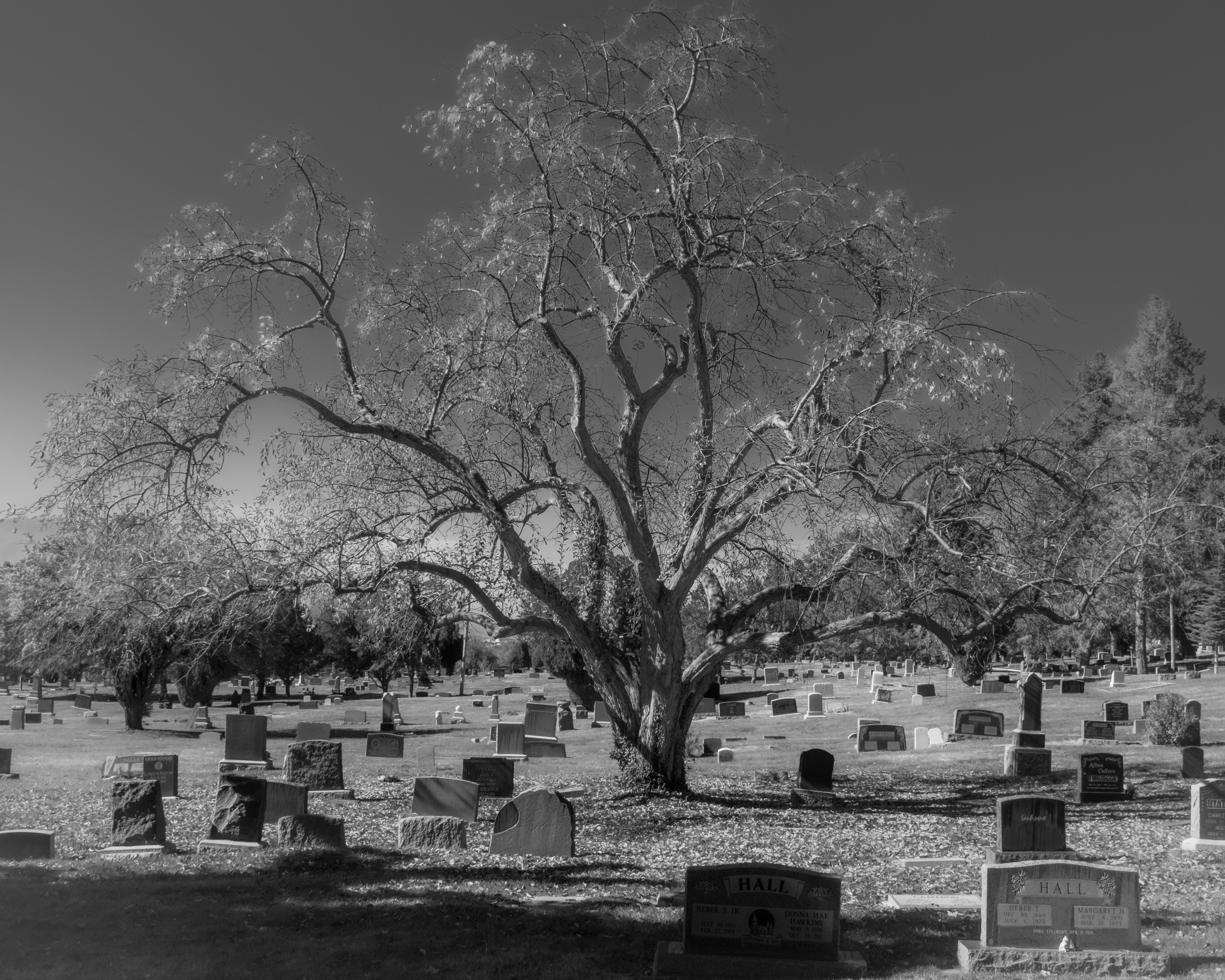 a black and white photo of a tree in a cemetery