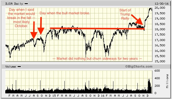 The market did break back in 2015 when I said it would, but it fell only 10%. It was, however, much more than a mere correction because it did not recover for a very long time. After a long period of rising, the market took to big plunges and did not recovery until the Trump Rally accomplished what few were expecting (including me):