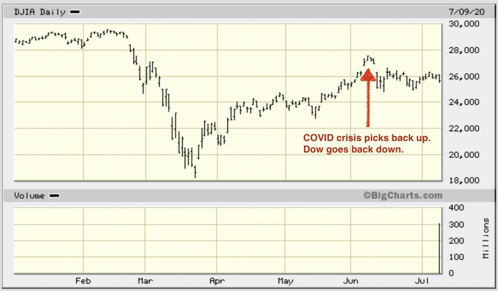 So, we see the stock market proving both claims true -- that a rise of COVID-19 would knock the wind out of the euphoric bulls but that, absent a host of new COVID-19 headlines, the bulls would continue to focus on the great reopening news because the worst news would come later.