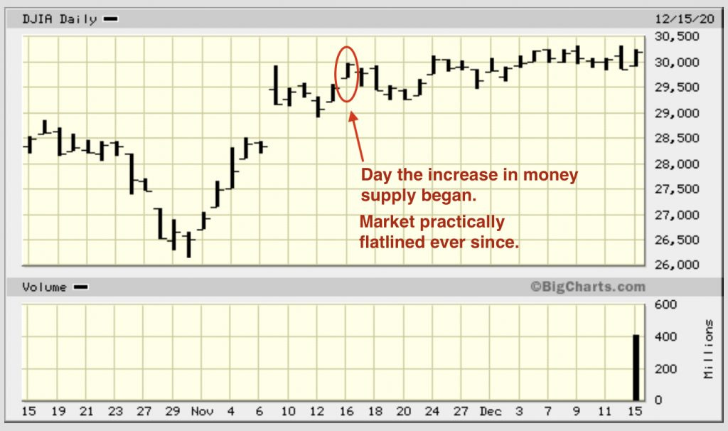 The Fed and/or its members banks MASSIVELY increased cash money supply (M1) in the last two weeks of November, and you probably didn't even know it happened! No one even noticed. And what did stocks do? They essentially held flat along the same ceiling throughout the time of this monetary mainlining.