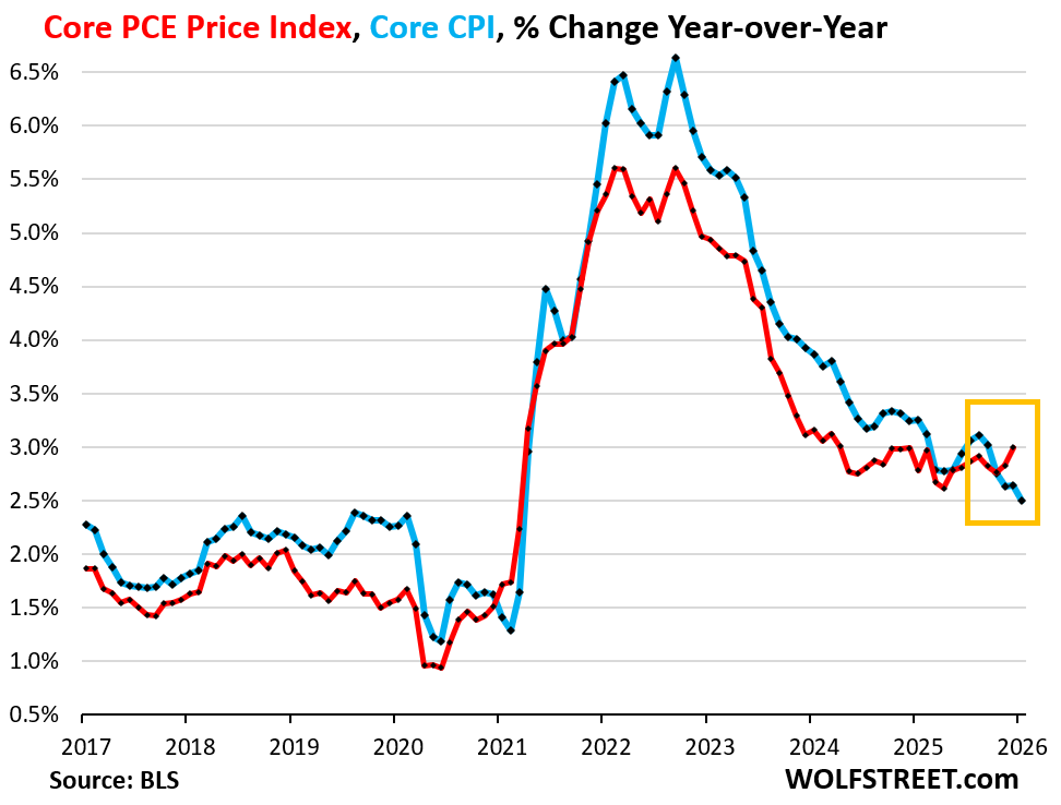 The PCE price index, the inflation measure that the Fed favors as its yardstick for its 2% inflation target, accelerated to +2.9% year-over-year in December, the most inflation in nearly two years, according to delayed data released by the BEA today (red in the chart). It started accelerating in April. On a monthly basis, it jumped by 0.36% (4.4% annualized). The six-month average accelerated to 3.0%, the worst since June 2024….