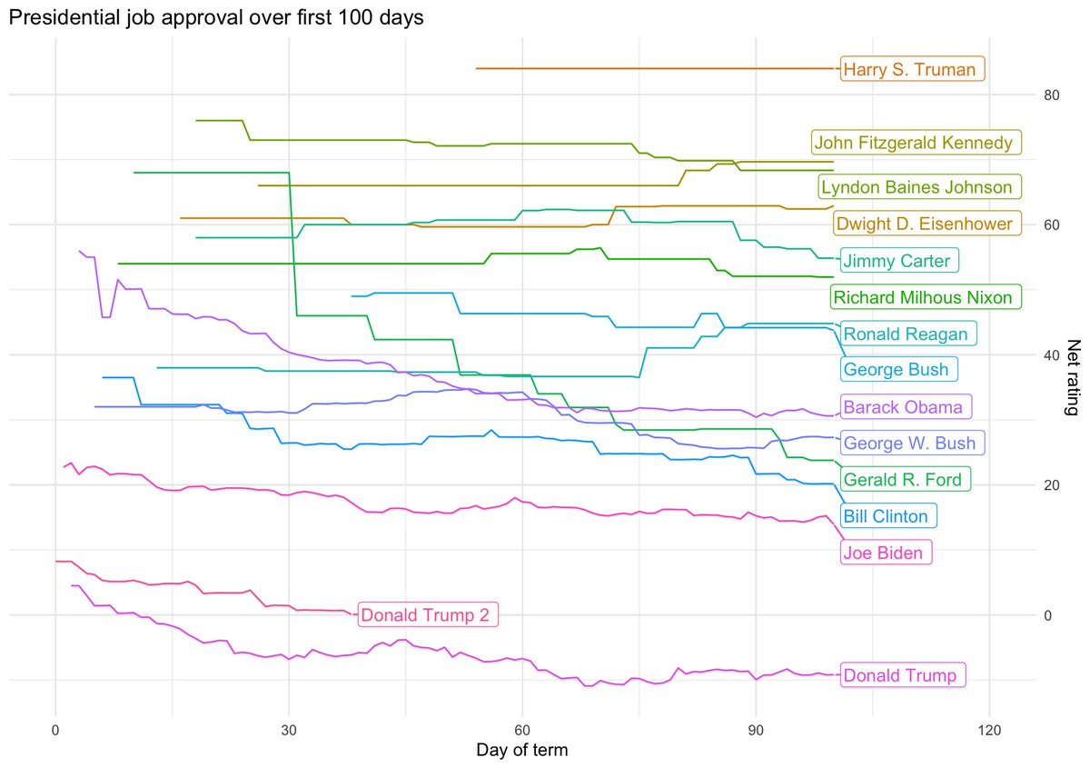 Me: Not sure what on earth he’s looking at. A chart published in Wednesday’s array of headlines shows that no president in history, other than Trump in his first term, has experienced lower approval of his actions during his first hundred days in office. Second lowest-was Joe Biden, but he was still well above where Trump places in both terms: