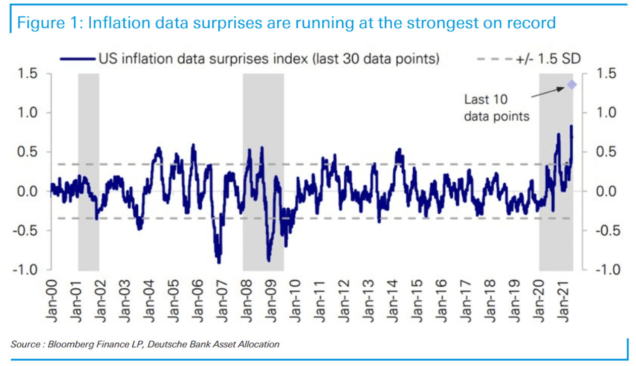 The chart shows U.S. inflation data surprises at their highest in the 20-year history of the series, said strategist Jim Reid, referring to a note by equity strategist Parag Thatte. The last 10 data points were “almost off the chart,†he noted.