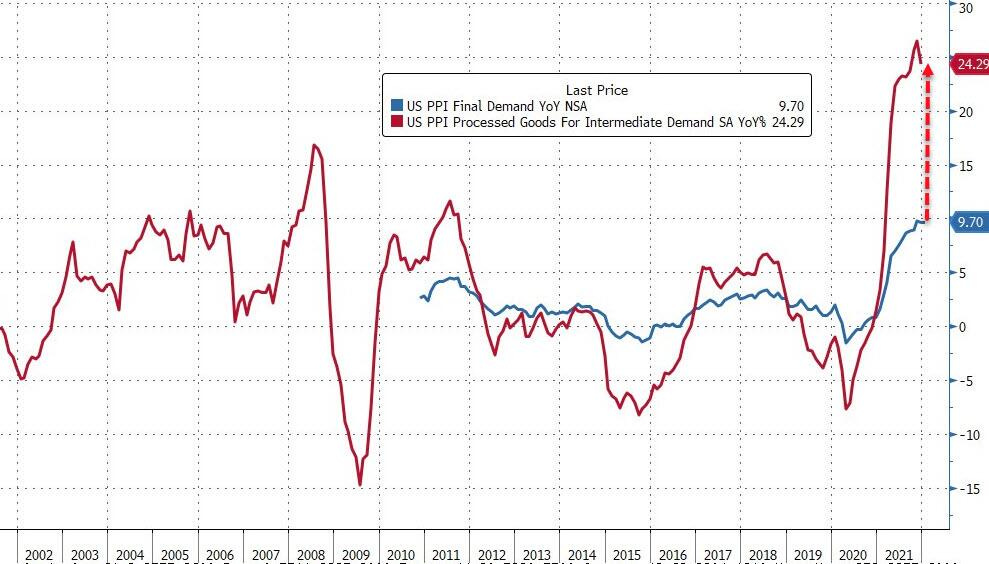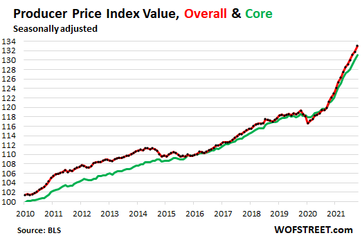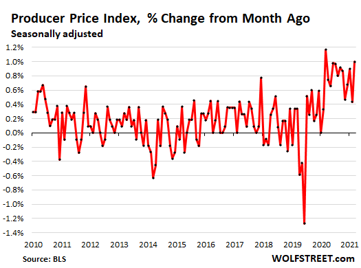 The [overall] producer price index, which measures final demand goods and services, increased 1% for the month, against the Dow Jones estimate for 0.5%. Over the past 12 months the gauge rose an unadjusted 9.7%, close to a record in data going back to 2010.
