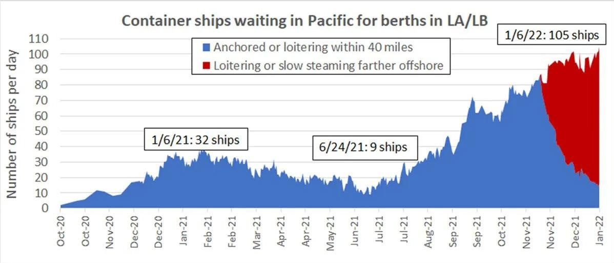 Clearly NO headway has been made since the backlog began to develop one-and-a-half years ago! The only thing that changed is that ships started waiting out at sea for their turn at port, rather than at anchorage around congested ports. That's not a reduction in backups. It's a traffic revision due to congestion. And that is where things were just before the war and its sanctions. So, do not accept the likely coming lie that all inflation from this point forward is due to the war and its sanctions. There was NO reprieve anywhere on the horizon!
