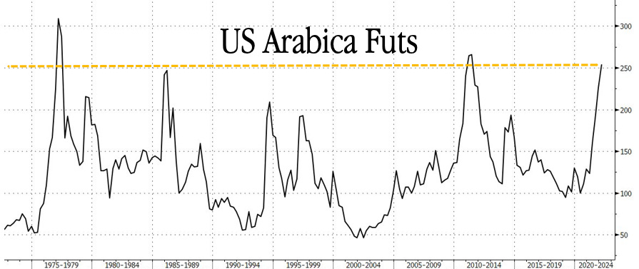 In case you think you're going to steady your nerves about that with a soothing cup of coffee, Goldman's head commodity strategist and one of the closest-followed analysts on Wall Street, as ZH described him, said he’s never seen commodity markets pricing in the shortages they are right now: