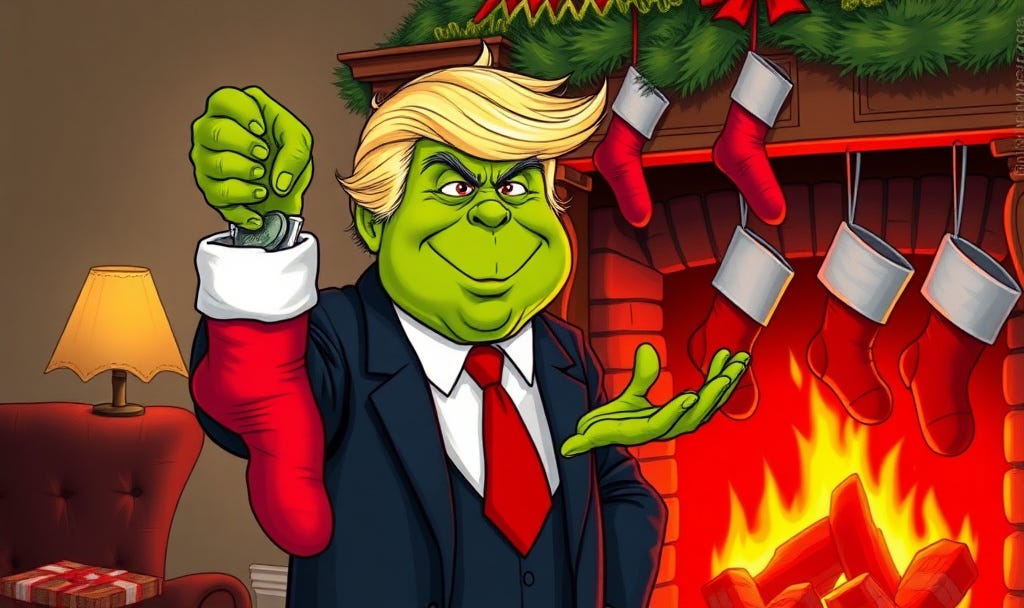 Graphic novel illustration of Trump looking like the Grinch, shaking a Christmas stocking UPSIDE-DOWN. He is dumping its candy into his wide-open mouth. Other stockings are hanging from the fireplace mantle in the red glow of the fire.As Trump settles down from his recent raging against voters for being obsessed with inflation, having claimed inflation was now a Democrat hoax, one of today’s articles talks both about the inflation that is happening and the inflation that is not happening due to the president’s tariffs. According to limited available government reports, Trump appears to be right.