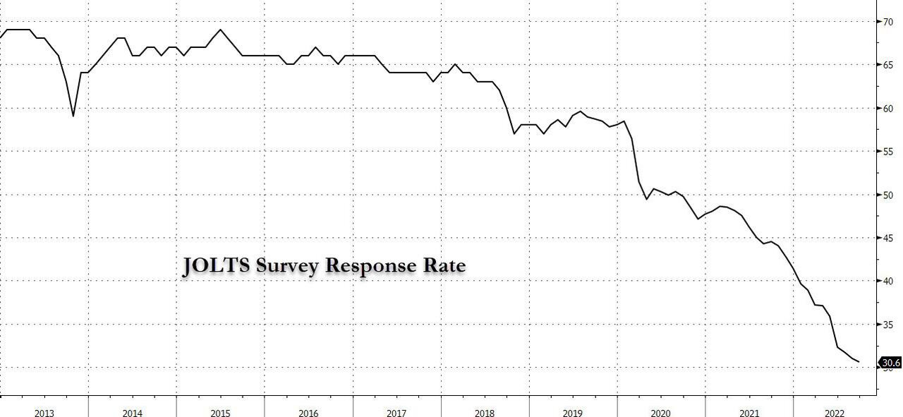 The answer is simple: well over half of it - or some 70% to be specific - is guesswork. As the BLS itself admits, while the response rate to most of its various labor (and other) surveys has collapsed in recent years ... nothing is as bad as the JOLTS report where the actual response rate has tumbled to a record low 30.6%!