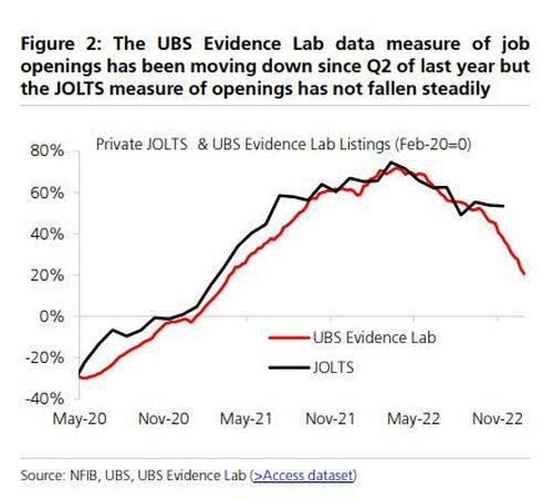 Of course, such a high level of job openings [as reported by the BLS] is alarming to the Fed for the simple reason that it means Powell has failed at his mission at cooling off what appears to be a red hot jobs market.... Whether on purpose or accidentally, the BLS is fabricating data.... As usual there is BLS "data" and everyone else… and as UBS cautions, other measures of openings tell a very different story: "Our UBS Evidence Lab data on job listings is weekly and more timely than the BLS series. The last datapoint is for the week of December 31. It shows openings down 30% from the March 2022 peak and only 25% higher than the 2019 average...."