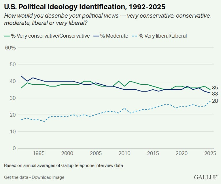 Most of the new independents, however, have peeled off of the Democratic Party, and so they also indicate they lean liberal, which means the expansion of those who identify as “independent” does not equal a consolidated voting bloc of centrists or moderates, but just a big mob of disenfranchised people who think the party they have long favored is inept or corrupt. Nevertheless, moderates and conservatives each still outnumber liberals overall, but the number of liberals is rising to meet them as the other two groups are falling. The biggest move away from parties has happened in the younger generations.