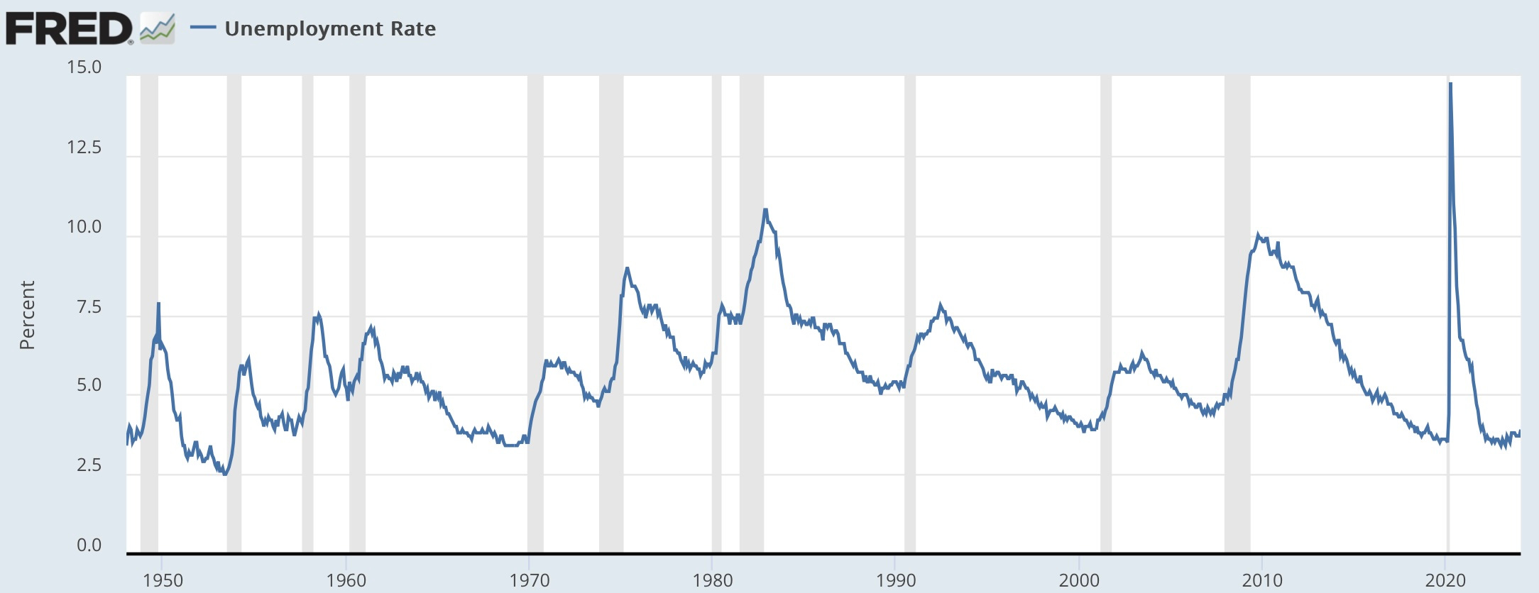 In a March Deeper Dive, I wrote about the importance of the rise to 3.9% that had just happened in February in terms of how strongly it pushes the Fed to cut rates. I used this graph to show how, as soon as unemployment wiggles up, a recession begins, unemployment soars, and the Fed starts cutting rates: (Gray bars are recessions.)