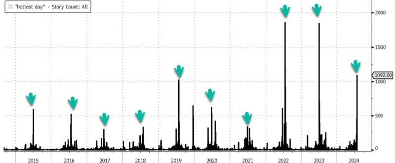 Bloomberg data shows that headlines featuring the 'hottest day' ever in corporate media soared this month. This spike in climate doom headlines is an annual occurrence in July for the Lower 48.