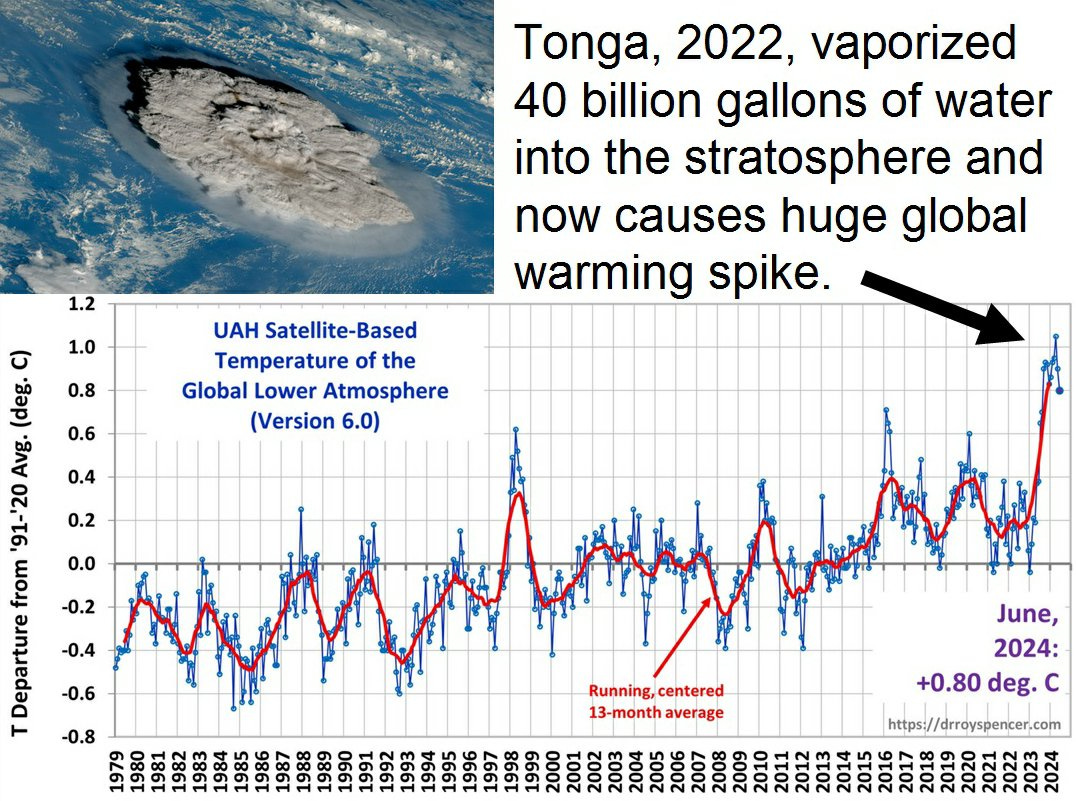 Another meteorologist from outside the approved climate club asked how they could know all of these historic record “temperatures” were from human-caused climate warming when the multi-nuclear-sized blast from the Tonga volcano that vaporized 40-billion gallons of insulating water into the stratosphere is the more likely culprit.