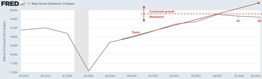 First, let's look at the Federal Reserve's graph of real GDP, just updated today, so we can use their accepted numbers with my additions in red to prove we have been in a real recession since the start of the year with this second quarter taking us deeper into recession. Even IF the change in GDP had not been negative in the second quarter, but had simply held flat, we would still be at the Q1 level, and GDP would, therefore, still be in recession from where we started the year. That is not how the NBER defines a recession, but it is how I define it based on the simple fact that it means the economy has receded and remains below where we were at the start of the year; therefore, we are in a "recession" -- a prolonged period where production had receded from where it was ... even if it didn't recede further.