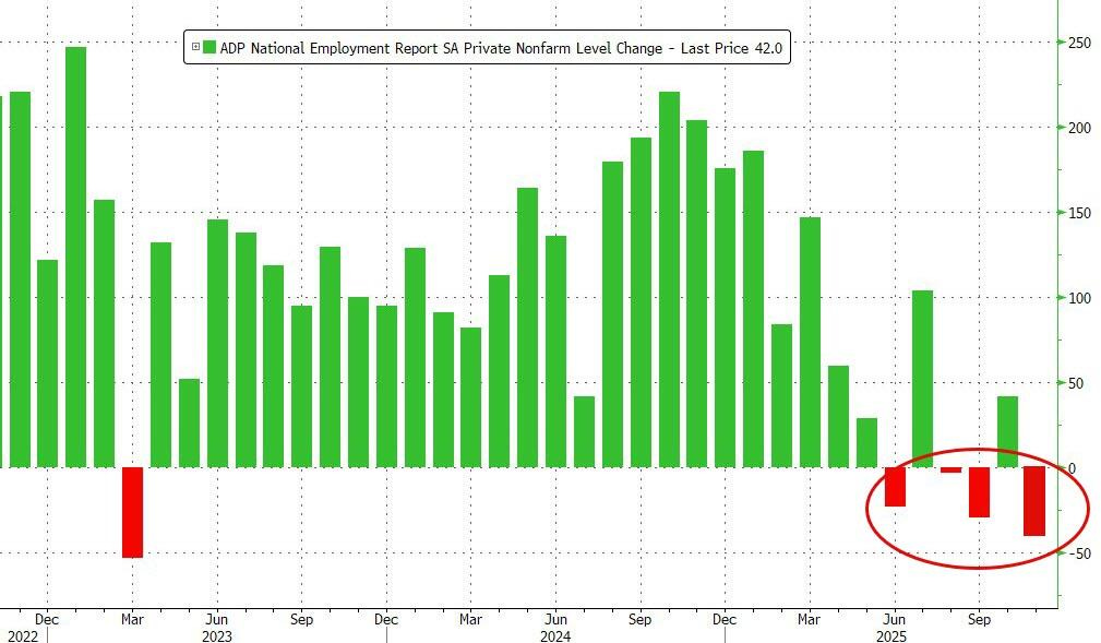 The ADP weekly jobless report pointed to a deterioration in US labor momentum, stating that “for the four weeks ending Oct. 25, 2025, private employers shed an average of 11,250 jobs a week, suggesting that the labor market struggled to produce jobs consistently during the second half of the month.”