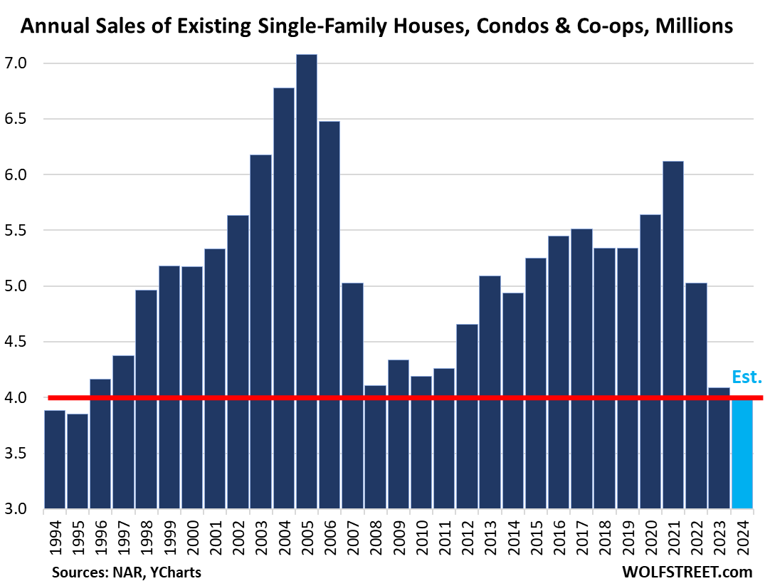 Another crowd in flight in today’s news is the home-buying crowd, but they have nowhere to go. Highly inflated home prices created demand destruction on an epic scale during 2024 to a rock-bottom level of sales, even though October just got a small uptick due to a brief drop in mortgage interest that has already started rising again since inflation started rising again, causing bond yields to rise again. Up, up, and away.