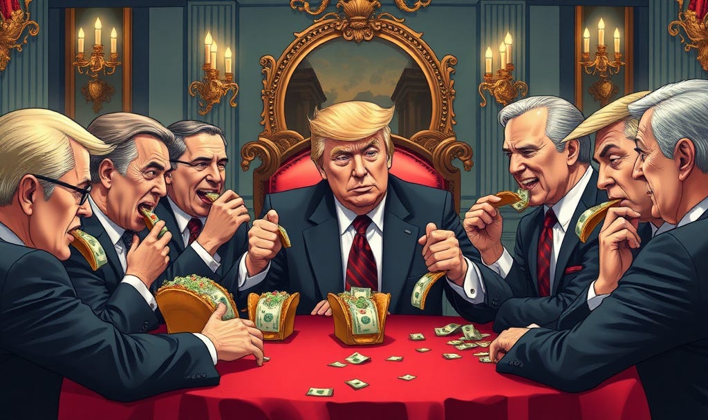 Can anyone believe the president was either too dumb or too bashful to get the jump on that trade in order to profit more than anyone? With total immunity and no chance of a third term to worry about, why would he hesitate? It is far harder to believe he did not profit immensely off of the TACO trade than to believe he did, since making money off of great deals is supposed to be the area of Trump’s boasted genius. I don’t see how he could miss the opportunities he is creating. This is, after all, the guy who openly sold access to a Mar-a-Lago dinner for $100,000,000 investments in his crypto $Trump, far excelling Biden’s selling of presidential access, and Biden would have also been very secretive about it. Trump does it brazenly in the open because of his clarified immunity.