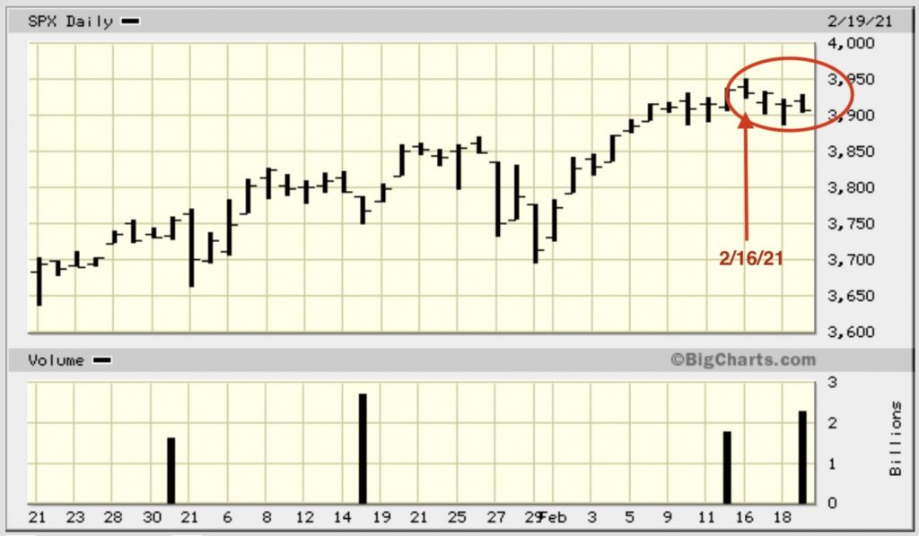 ... you see that market mania in the S&P 500 topped out (for the moment anyway) at the same point, as I had said we could expect. It has been churning slowly downward since then as investors start to struggle over what to make of yields that are holding above one-and-a-quarter due to inflation concerns:
