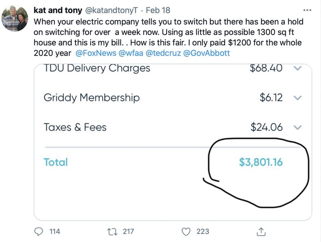 Witness how things worked out in Texas the last two weeks when skyrocketing natural-gas prices caused people's electric bills in many place to shoot from $450 per month to $3,500 for the past month or even higher. Factor that!