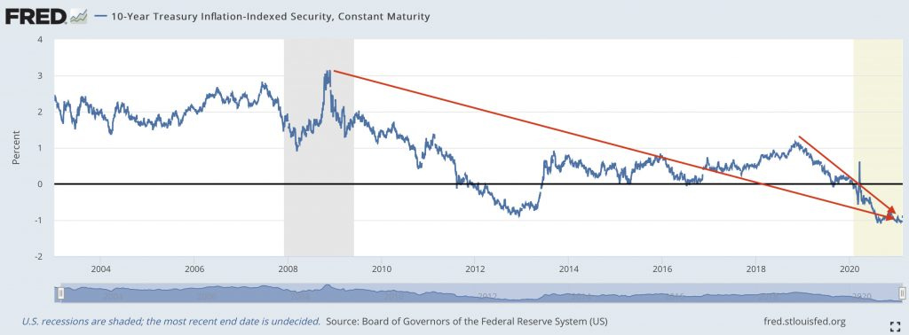 1) We are following a long period of declining real rates. Real rates have been dropping steeply since the start of 2019, and been on a longer-term trend since the start of the Great Recession: