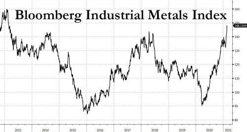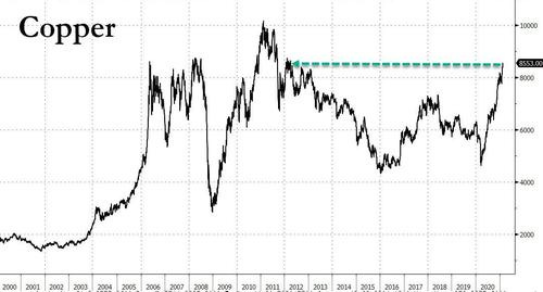 It is only a matter of time before we see a new all time high. Indeed, overnight copper extended its surge to a nine-year high as Goldman Sachs warned of a historic shortage with "the market now on the cusp of the tightest phase in what we expect to be the largest deficit in a decade" as Chinese buying "triggers the next leg higher" adding to expectations that prices will near a record sooner rather than later....