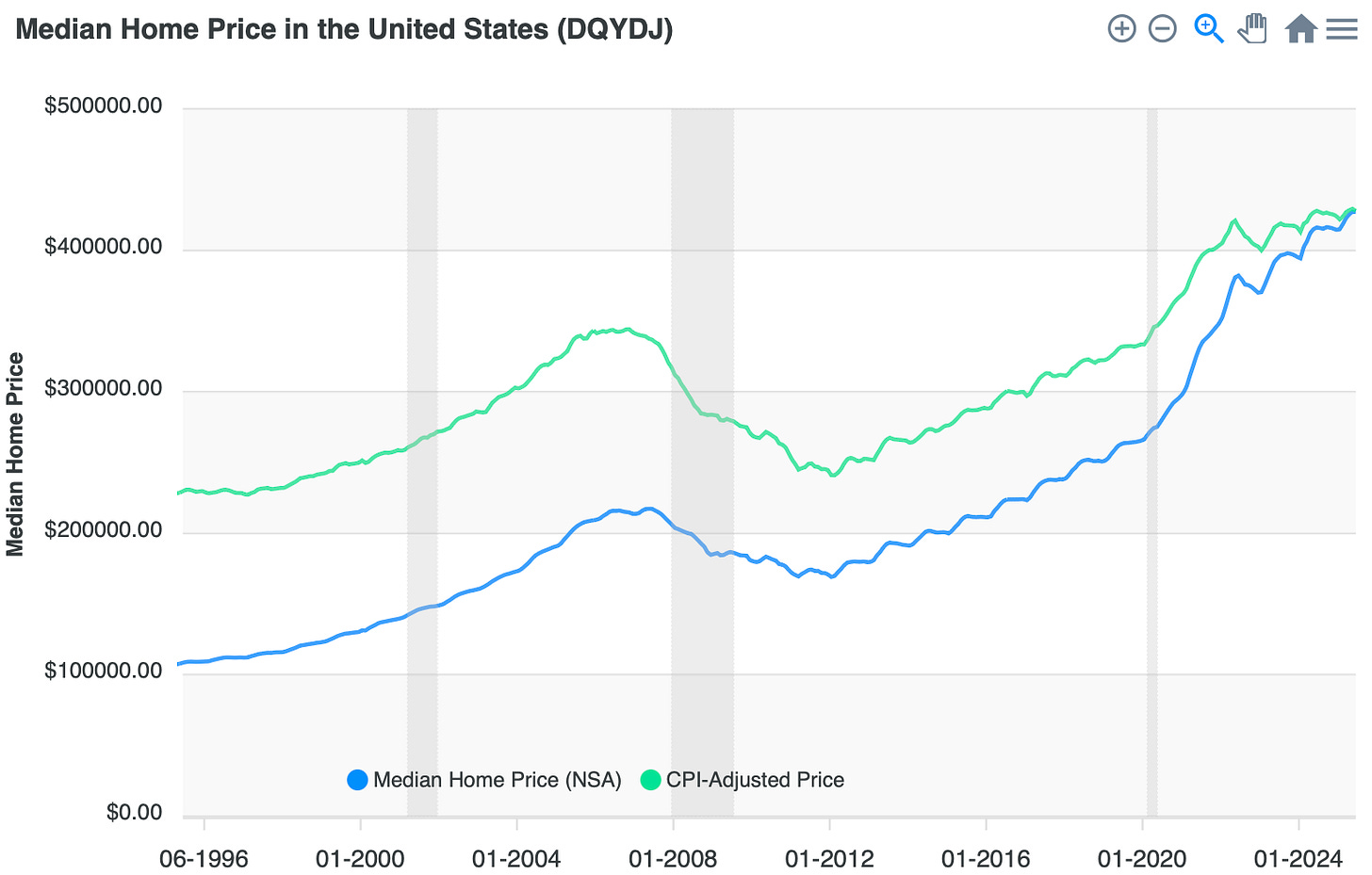 Now, you might be tempted to think Jerome Powell leaped in last week just in time to try to start saving things. However it’s nearly certain that his quarter-point rate cut won’t make a dime’s worth of difference. In fact, it’s unlikely several rate cuts will make a big enough difference with housing prices now being the highest they’ve ever been by far and just starting to tumble.