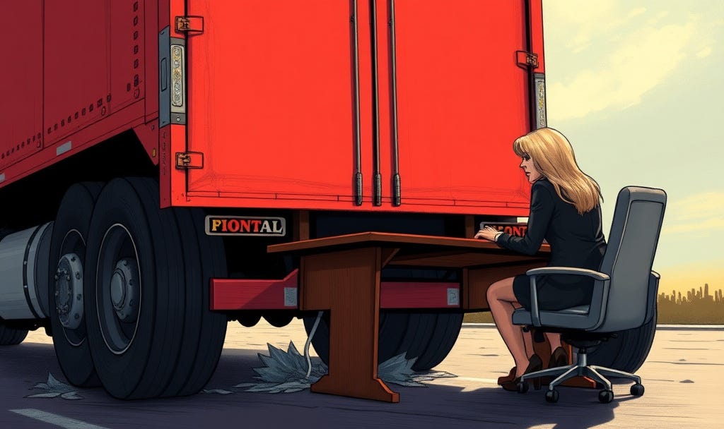 With millions of files now admitted to exist—a volume of documents so great it has taken 500 Department of Justice employees several months just to go through and redact about half of them—the ONLY way the files were sitting on Bondi’s desk would be if a semi trailer was parked on top of her desk. “Back her up, Boys. Shove the files out here!”