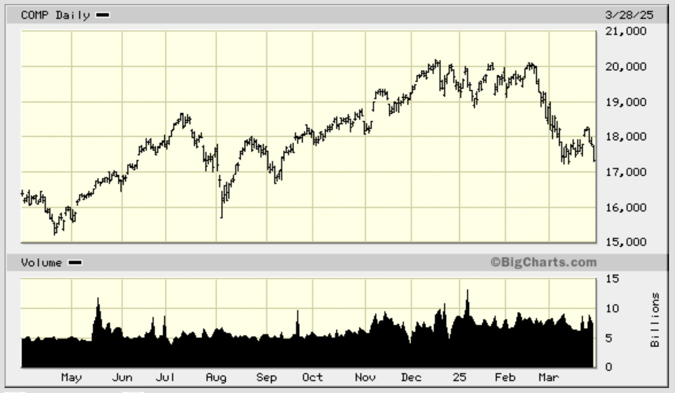 Make that more than 700 points now that Friday is over (with the Nasdaq falling another 2.7% on Friday. The Nasdaq has seen a pretty sharp falloff since December, erasing a lot more than all of its post-Trump-victory gains, down 14% from its all-time high: