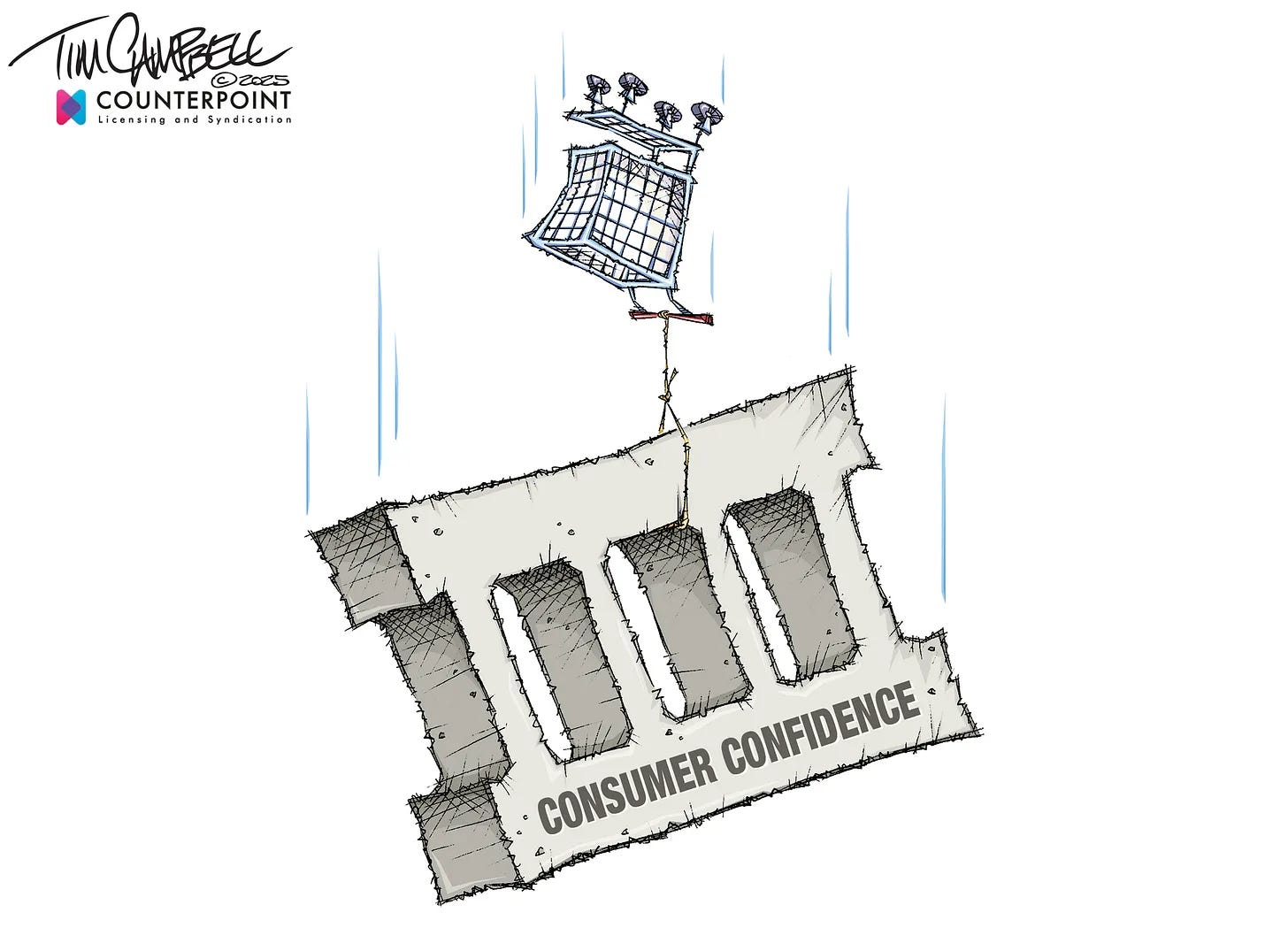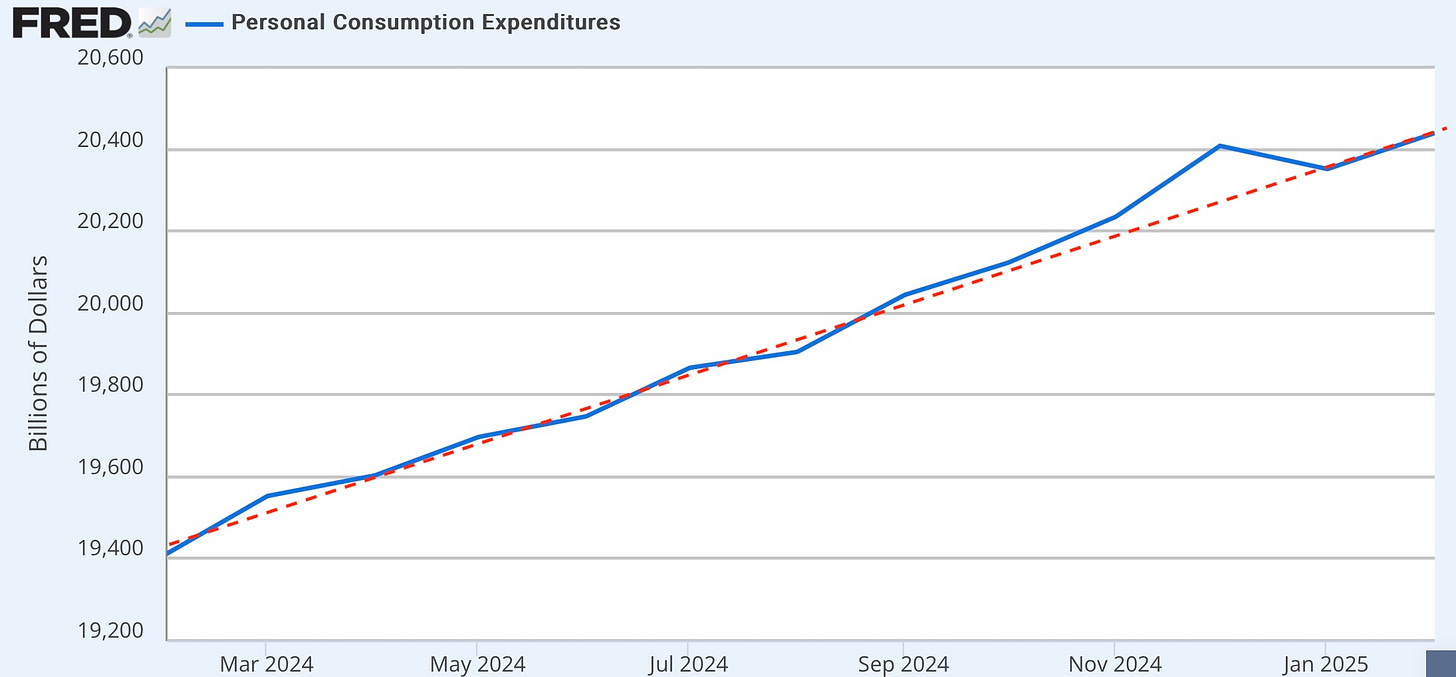 It’s too early for added import taxes to raise the price of goods on the shelf. Those goods are not likely even on the shelves yet, and most of Trump’s threatened tariffs are still in their Lucy-pull-the-football stage of withdrawal. There could be some anticipatory raising of prices starting to bleed through, but most businesses will be reluctant to raise prices until they have to because one more significant factor in the news today is that consumer spending is falling, as is consumer confidence. The two go hand-in-hand.