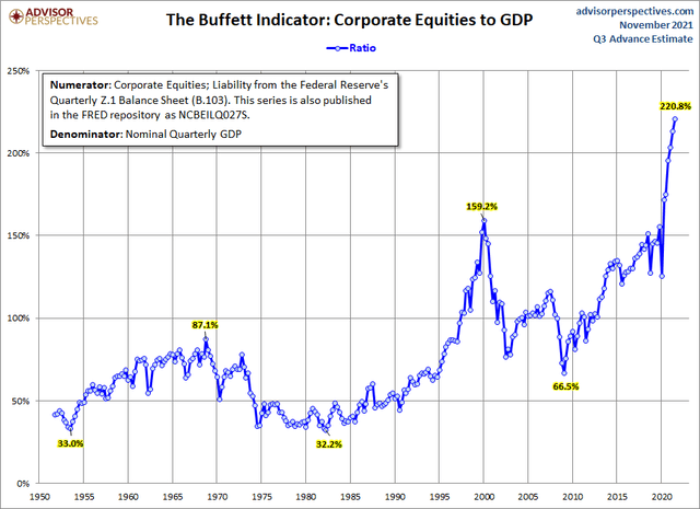 Based on Warren Buffet's favorite indicator of stock-market over-or-under-valuation, the market is far more overvalued than it has ever been relative to the economy at anytime in history.