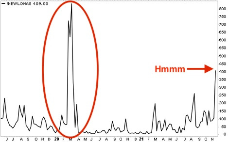 When that happened, the number of NASDAQ stocks hitting new lows looked like this: