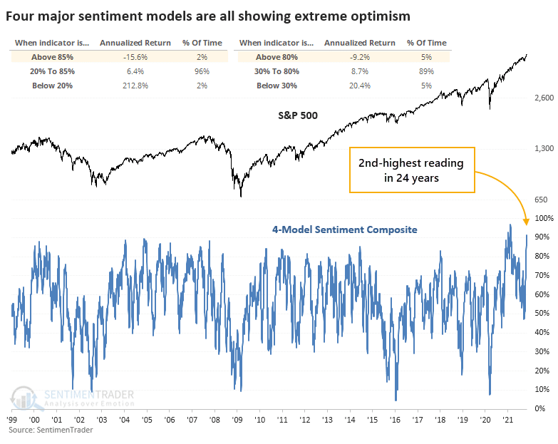 The chart [below] shows us that the S&P 500’s annualized return when the composite model was above 80% was a miserly -9.2%. When the model was above 85%, accounting for about 2% of all days since 1998, that return was a horrid -15.6%.â€