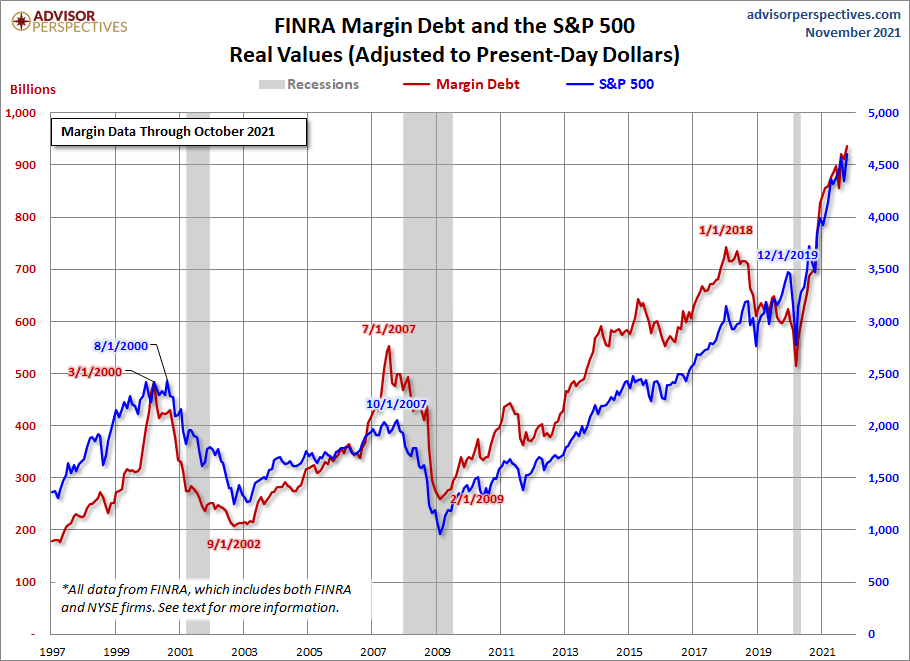 Oops. Looks like use of leverage used to buy stocks (money borrowed from brokers) is in the nose-bleed section, too. Leverage becomes tighter when the Fed tightens monetary liquidity, and leverage is already higher in terms of inflation-adjusted valuations (something we need to be factoring in now) than it was before the two worst crashes since the Great Depression.