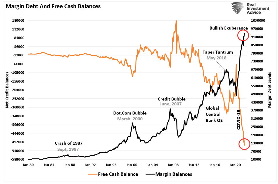 That is an extremely precarious position, carried to such near-record heights (beaten only just before the Great Recession crash) due to extreme greed taking highly leveraged risks. When leverage tightens, as the Fed is assuring us it soon will, people in highly levered positions are pressed to sell. High leverage, thus, tends to equate with major and rapid crashes when a correction comes, especially if interest rises, tightening the noose on leverage.