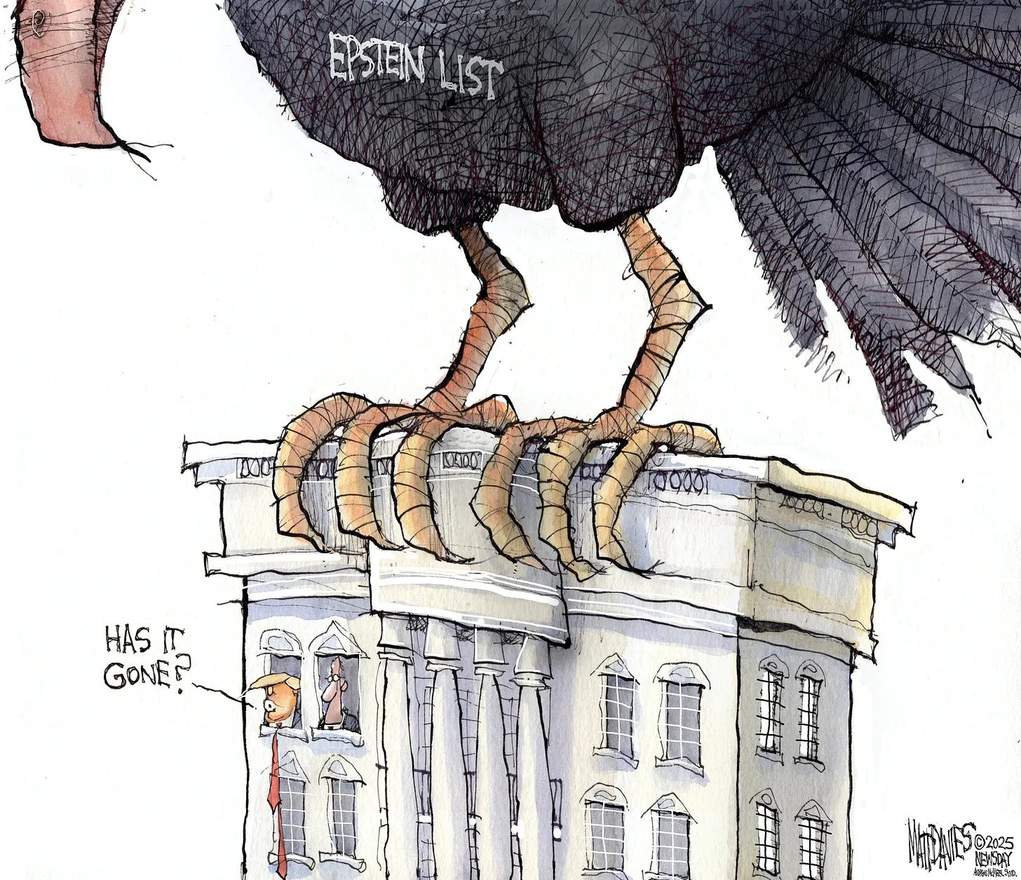 To placate the angry masses who think the government is covering something up, the Republicans released all the Epstein files today that were already released a couple of months ago. Dem’s complained that a lot seems to be still missing, but that mysterious minute that was never saved in the recording process accidentally popped back up and demonstrated how easily and quickly a guard could walk across the room at midnight to go kill Epstein. That has to be unhandy for a president who keeps demanding that all of this just go away because it is old news and boring so that we can concentrate on enumerating and praising all the good things he does.