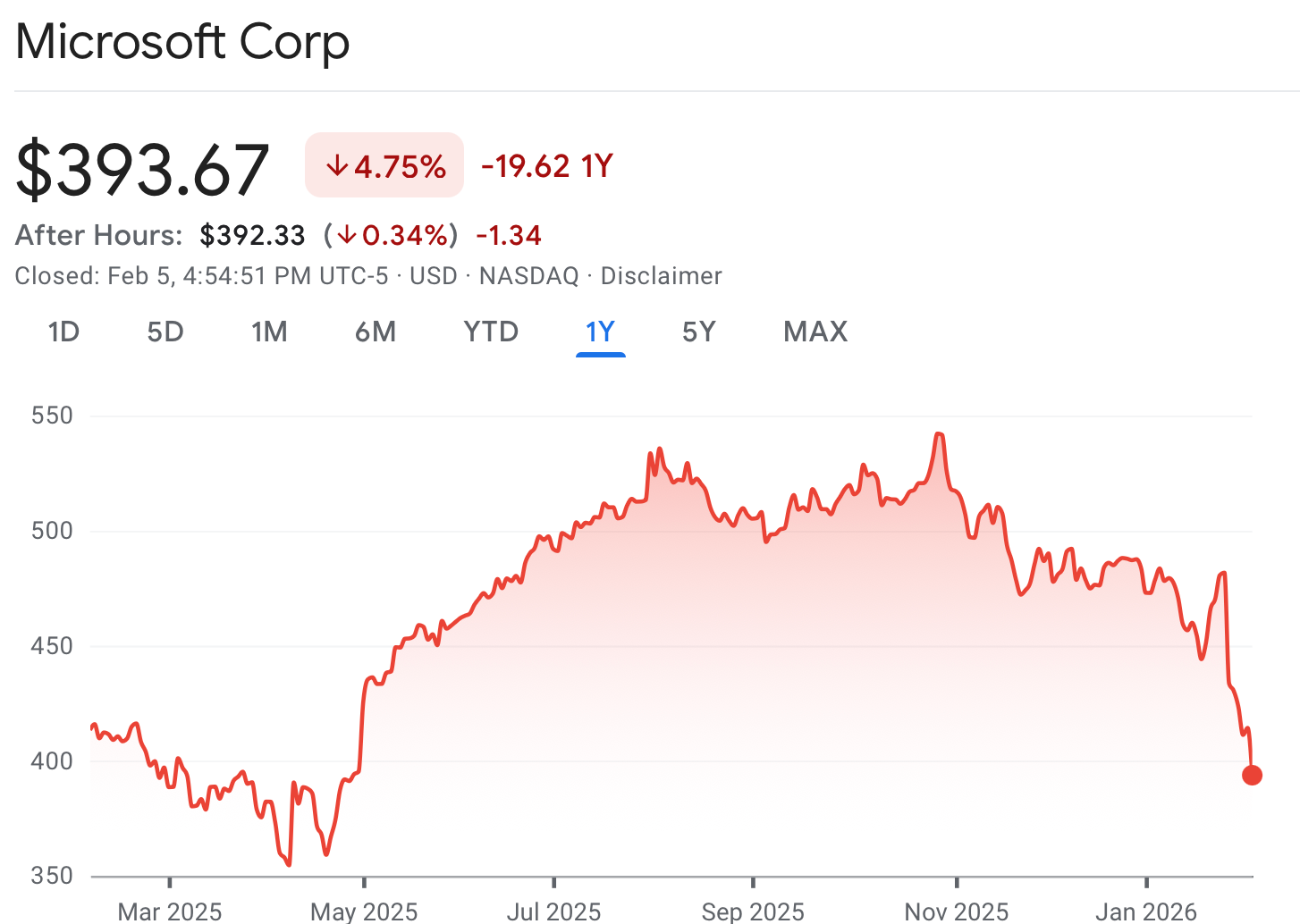 Microsoft lost another 5% at the bottom of the cliff it fell off of yesterday. That now puts it down a deeply bearish 27% since those heady days when brokers were telling their clients AI couldn’t lose like high-tech did in the dot-com days: