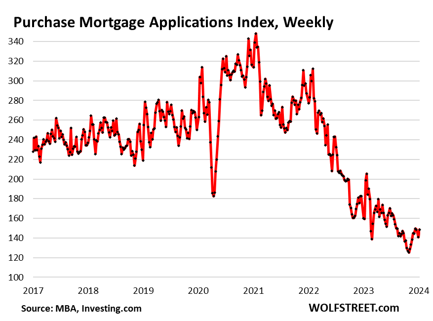 This was in response to data by the Mortgage Bankers Association today that mortgage applications to purchase a home during the week ended January 5th had risen by 6% from the prior week, seasonally adjusted. But in that prior week, applications had plunged from the week before the holidays, and so today’s reading didn’t even go back to where it had been two readings ago, and was down from the same week in: