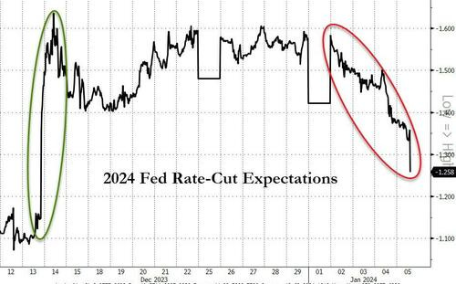 2024 rate-cut odds fell all week long to end up ALMOST back where they were before Powell’s dopey-eyed December press conference lit the fanatics on fire: