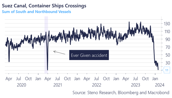 The interconnected, global economy is, of course already on the rocks due to some Houthis who aren’t such a hoot anymore. Shipping is foundering at virtually zero ships through the Suez Canal now and shows no signs of changing soon: