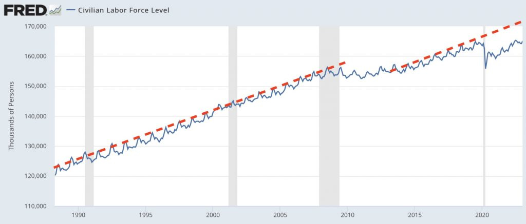You can see that quite easily below in this graph of the total labor force (not just the labor participation rate). You can see that the rise in the size of the total labor pool is basically constant with population growth, but the labor force broke significantly during the Great Recession, cataclysm as that was, and took several years for growth in the size of the labor force to get back on the trend (slope) that matches up with population growth, albeit at a lower level. Then the Covidcrisis with all its forced labor interference by government (lockdowns, vaccine mandates for workers) and chronic sickness and vaccine repercussions and early retirements hit, and labor has returned to growing, but very far below the former trend: