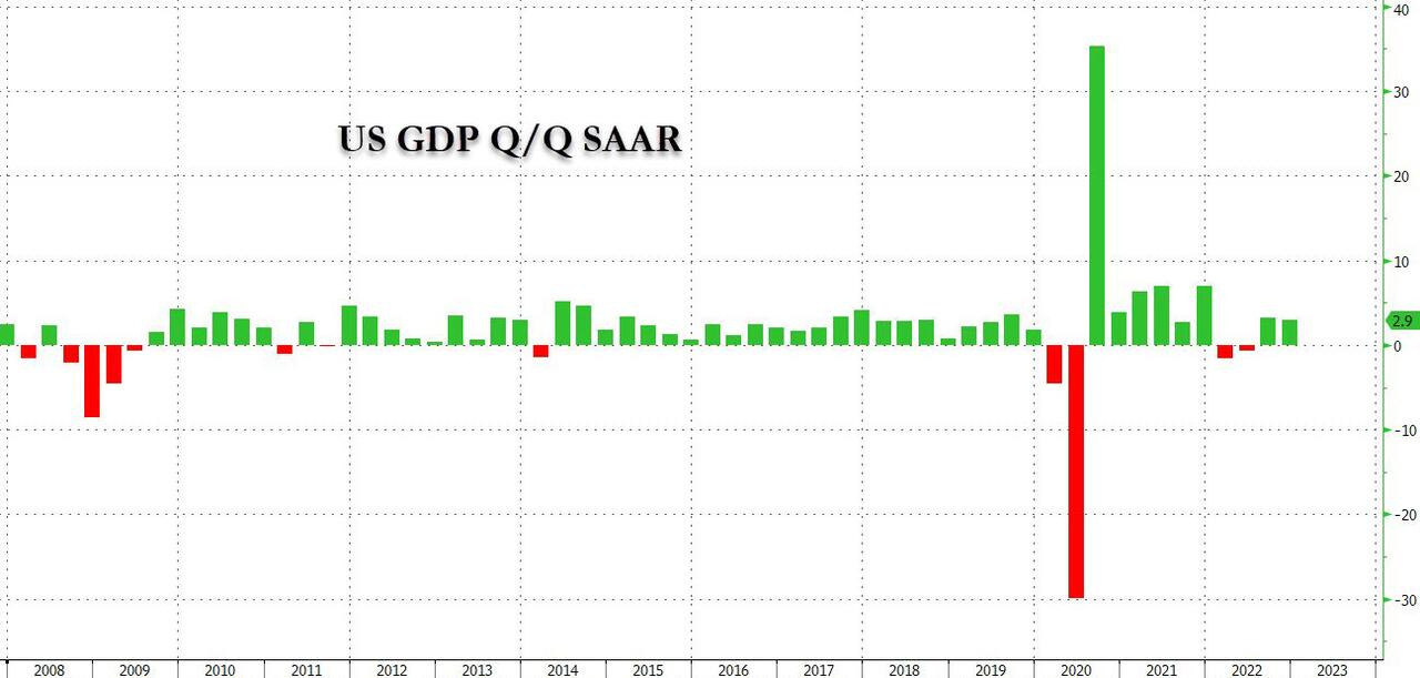 The BEA reported that in Q4, US GDP rose by a stronger than expected 2.9% (or 2.880% to be precise), a modest drop from the 3.2% in Q3 and well above consensus estimates of 2.6%....