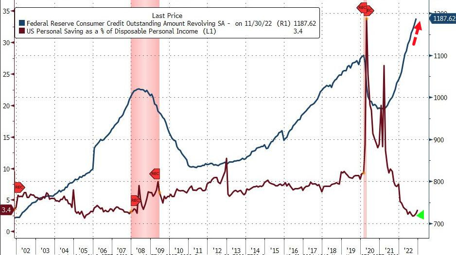The savings rate is still down in the trenches as Americans no longer have much disposable income to sock away. Instead, they are rapidly ratcheting up their credit cards to try to maintain spending in face of the high costs of continuing inflation (which was how I said two years ago inflation would rise to rip the economy to shreds):